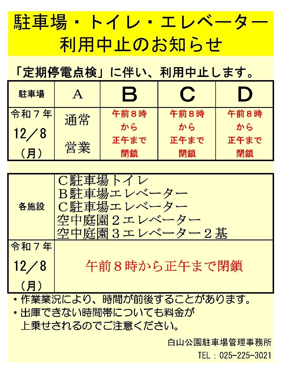 令和7年12月8日(月)駐車場とその他施設の閉鎖について