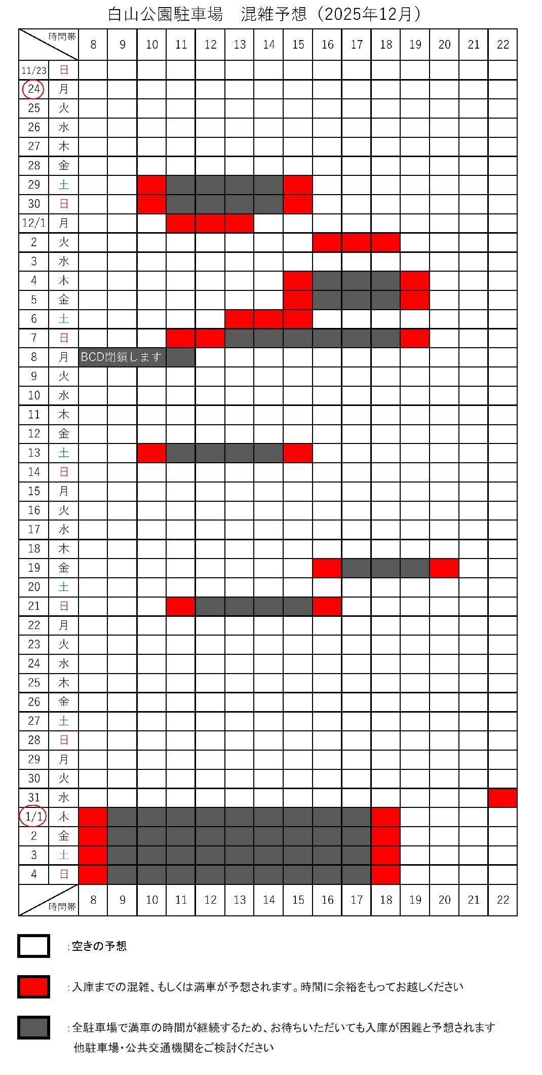 入庫に関する、混雑予想をお知らせします(バスのご予約に関する空満状況は反映されていません)